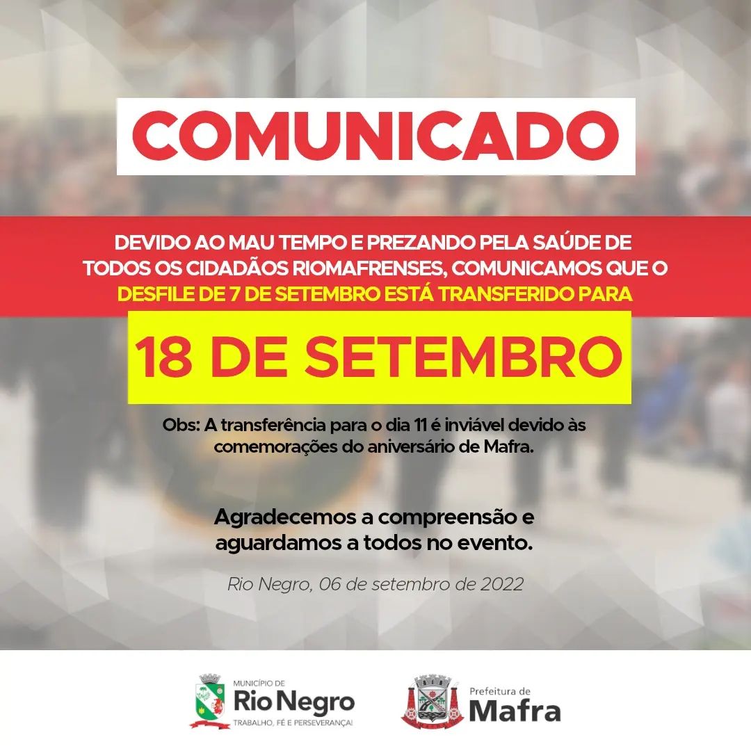 Devido ao mau tempo e prezando pela saúde de todos os cidadãos riomafrenses, comunicamos que o desfile de 7 de Setembro está transferido. NOVA DATA: 18 de setembro (domingo). Agradecemos a compreensão e aguardamos a todos no evento.