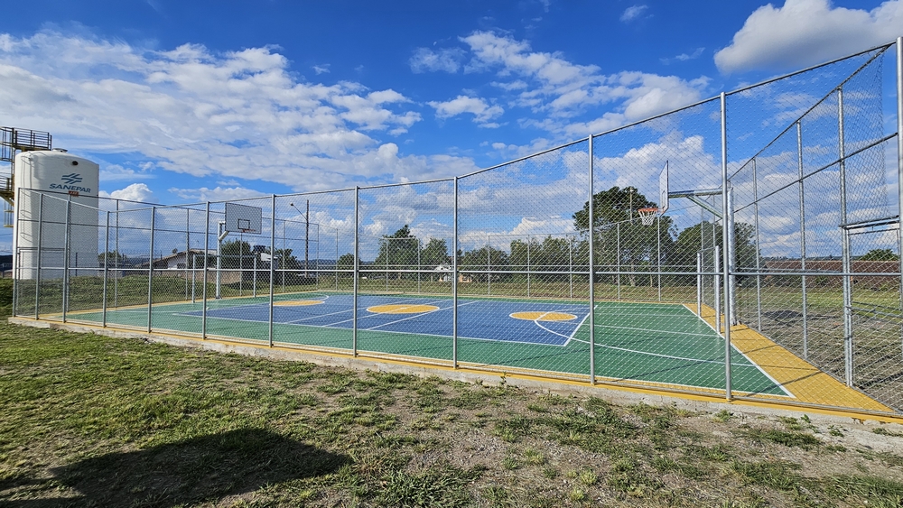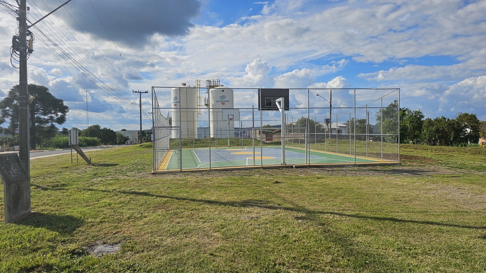 A quadra possui uma área de 260,00 m², com piso em concreto e pintura epóxi, faixas demarcatórias para as modalidades esportivas, cercamento com alambrado e tabelas de basquete e traves para futsal.