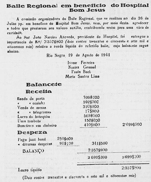 Em 1941 o jornal O Rio-negrense publicou o balancete de um evento que arrecadou auxílios ao hospital: