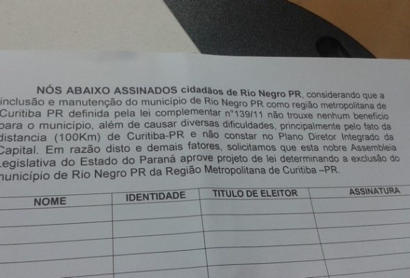 Abaixo-assinado pede a saída de Rio Negro da Região Metropolitana de Curitiba