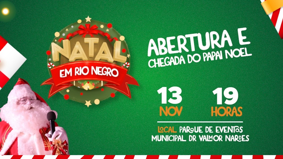A abertura do Natal deste ano ocorrerá neste domingo em Rio Negro no Parque de Eventos Municipal Dr. Valmor Nardes, que fica localizado na Av. Luiz Carlos Pereira Tourinho, na marginal da BR-116 no bairro Volta Grande.