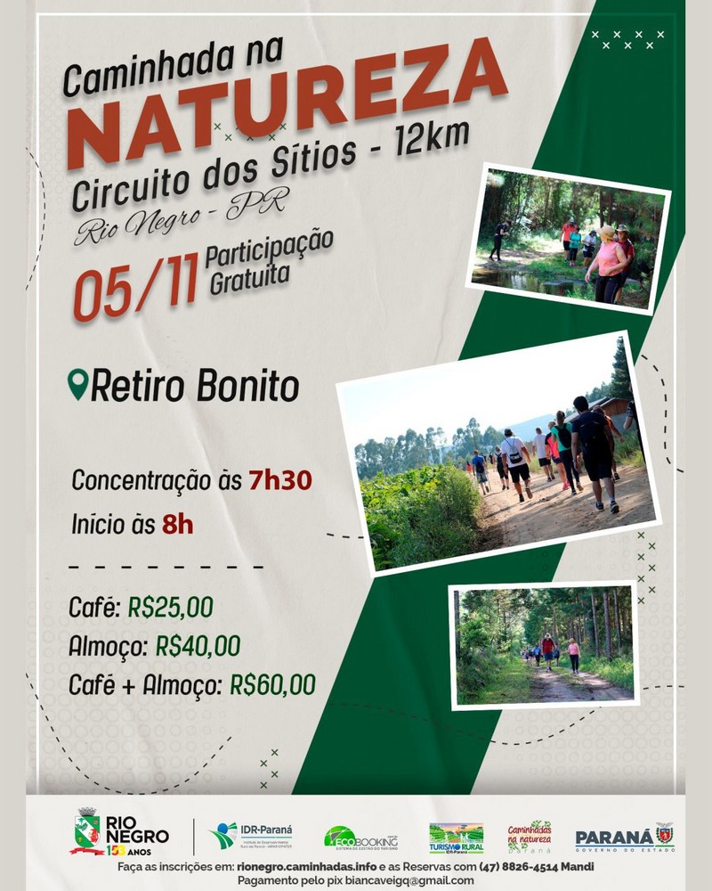 A concentração inicia às 7h30 na Associação de Moradores do Retiro Bonito e a largada está prevista para as 8h. As inscrições são gratuitas e podem ser feitas pelo site: https://rionegro.caminhadas.info/