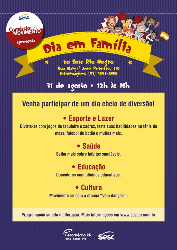 No dia 31 de agosto (sábado), das 12h às 16h, o Sesc Rio Negro terá mais uma edição do Dia em Família, com atividades gratuitas para todas as idades. Confira a programação: