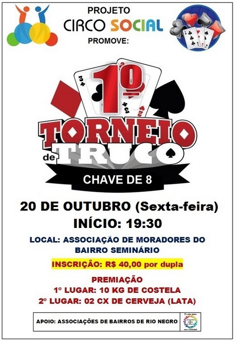 Na próxima sexta-feira (20), o projeto Circo Social promoverá na Associação de Moradores do Seminário em Rio Negro, o Torneio de Truco Chave de 8, em prol de suas atividades beneficentes realizadas em Rio Negro, Mafra e Campo do Tenente.