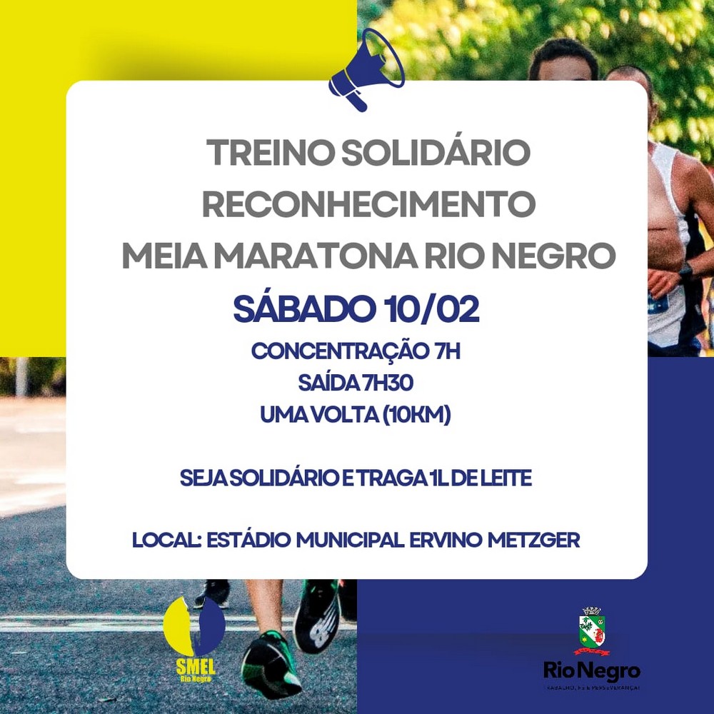 No próximo sábado (10), a Secretaria Municipal de Esportes e Lazer realizará o “Treinão Solidário” para a Meia Maratona Rio Negro, com o objetivo de reconhecimento do percurso dos 21 km. Será realizada uma volta no percurso, totalizando um treino de 10 km.