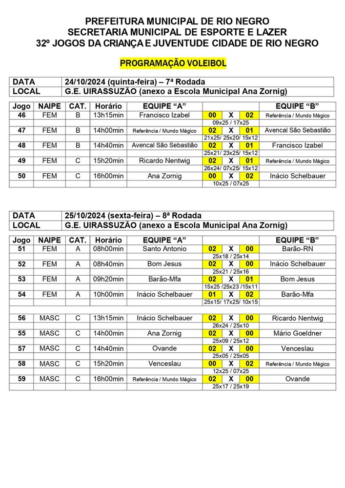 Em uma promoção da Prefeitura de Rio Negro, através da Secretaria Municipal de Esporte e Lazer, está sendo realizada desde o dia 16 de outubro a modalidade de Voleibol dentro da 32ª edição dos Jogos da Criança e Juventude Cidade de Rio Negro.
