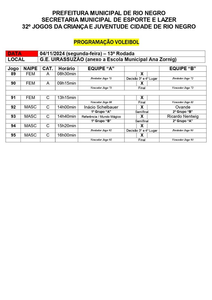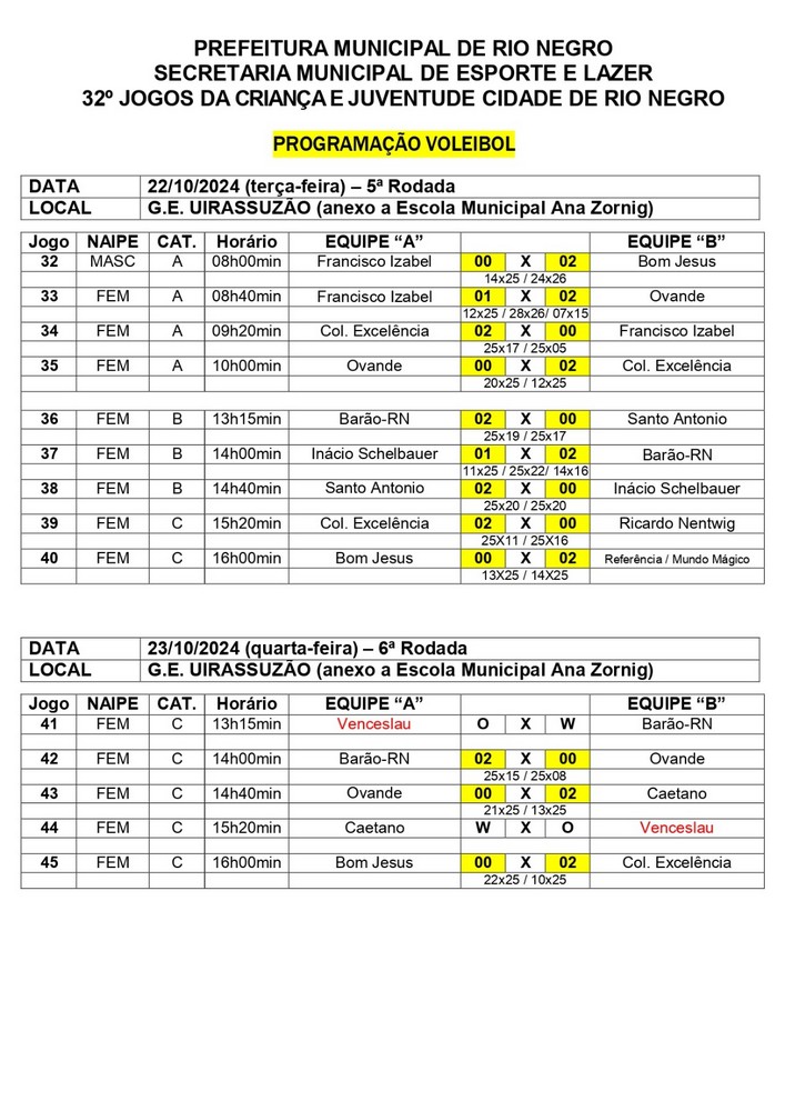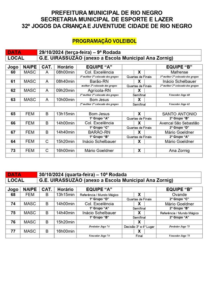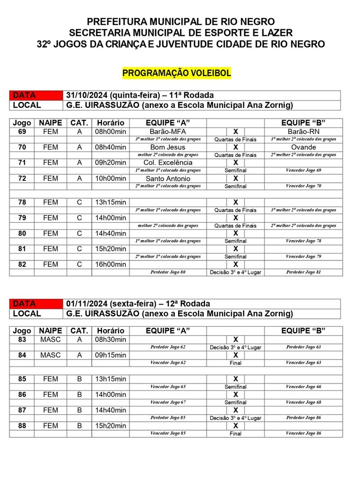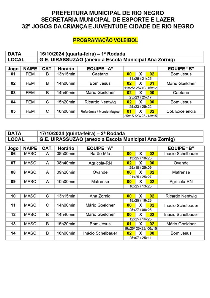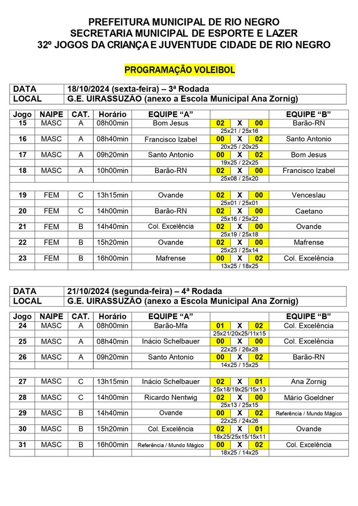 Em uma promoção da Prefeitura de Rio Negro, através da Secretaria Municipal de Esporte e Lazer, está sendo realizada desde o dia 16 de outubro a modalidade de Voleibol dentro da 32ª edição dos Jogos da Criança e Juventude Cidade de Rio Negro.