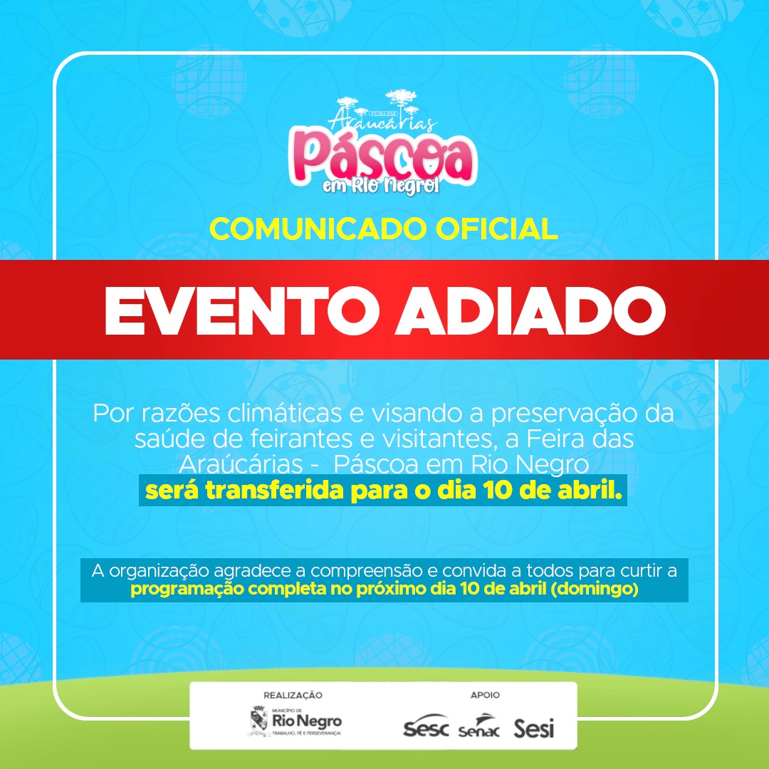 A Prefeitura Municipal de Rio Negro, através da Secretaria de Cultura e Turismo, comunica que a Páscoa em Rio Negro – Feira das Araucárias será adiada. O evento, que seria realizado neste domingo, 03 de abril, passa a ter nova data: 10 de abril. A decisão foi tomada devido a previsão de chuva intensa para este final de semana. O mau tempo prejudica a realização de eventos ao ar livre, desde a montagem de estruturas, os expositores que estariam participando, até o público que não consegue aproveitar toda a programação, especialmente da área KIDS.