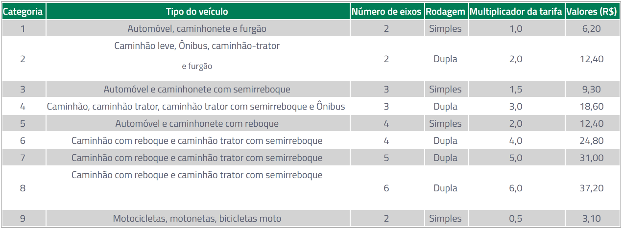 A Arteris Planalto Sul informa aos usuários que as tarifas praticadas nas cinco praças existentes ao longo da BR-116 possuem novos valores a partir da zero hora do dia 24 de julho (sexta-feira). A tarifa básica para veÃculos de passeio passará a ser de R$ 6,20.