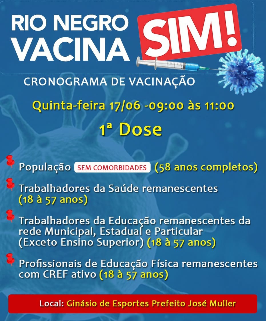 A cidade de Rio Negro divulgou o cronograma da vacinação (primeira dose) contra a Covid-19 para o público de 58 anos de idade completos sem comorbidades.