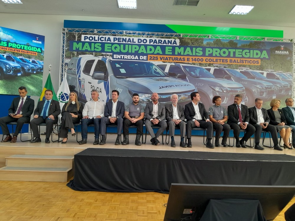 Na manhã desta segunda-feira (22), o prefeito de Rio Negro, James Karson Valério, participou da cerimônia de entrega de 1,4 mil coletes balÃsticos e 225 viaturas caracterizadas para a PolÃcia Penal do Paraná.