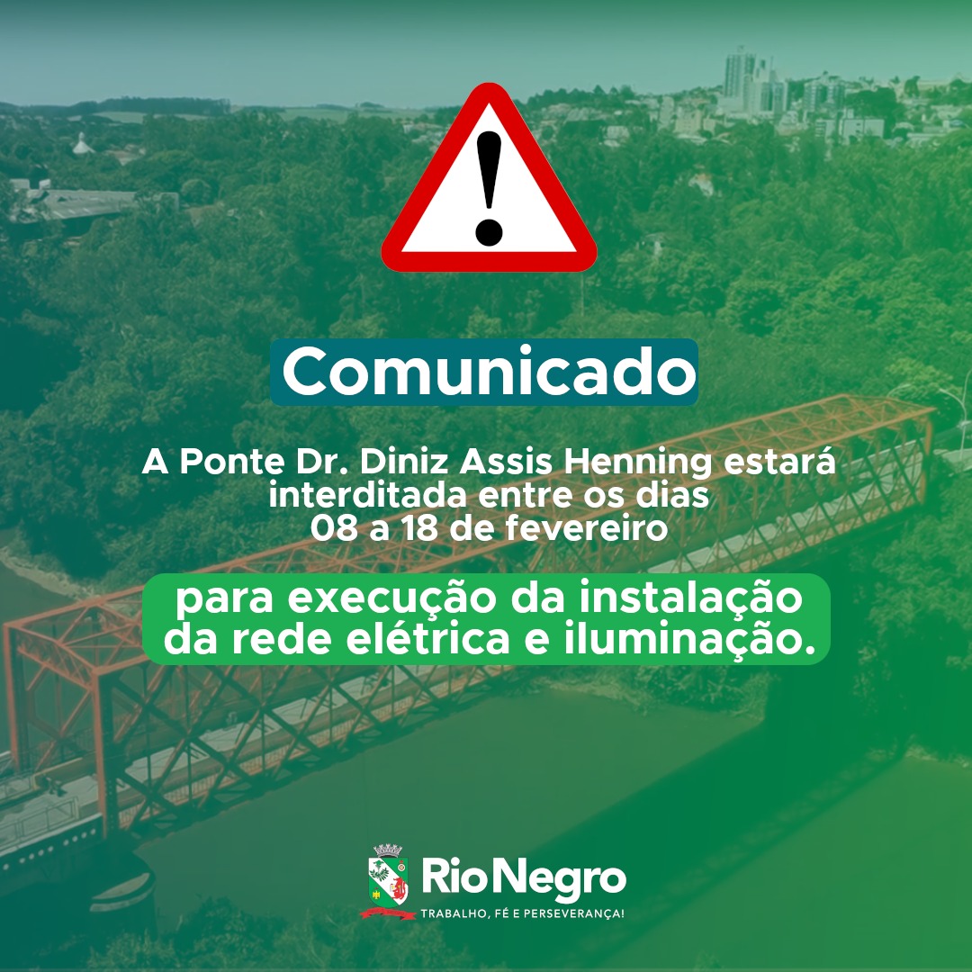 A Prefeitura de Rio Negro comunica o fechamento dos acessos a Ponte Dr. Diniz Assis Henning no período de 08 a 18 de fevereiro. O motivo do fechamento é a execução da instalação da rede elétrica e iluminação da ponte.