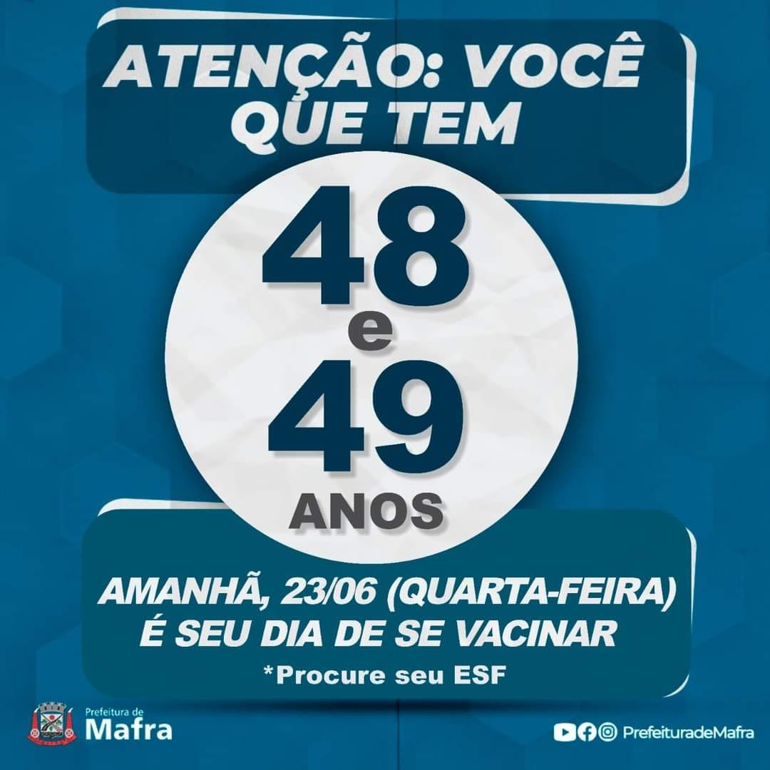 Em Mafra a vacinação ocorrerá para pessoas com 48 e 49 anos de idade.
