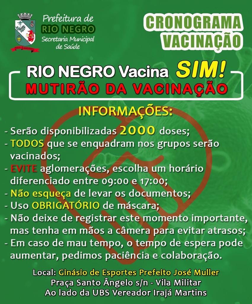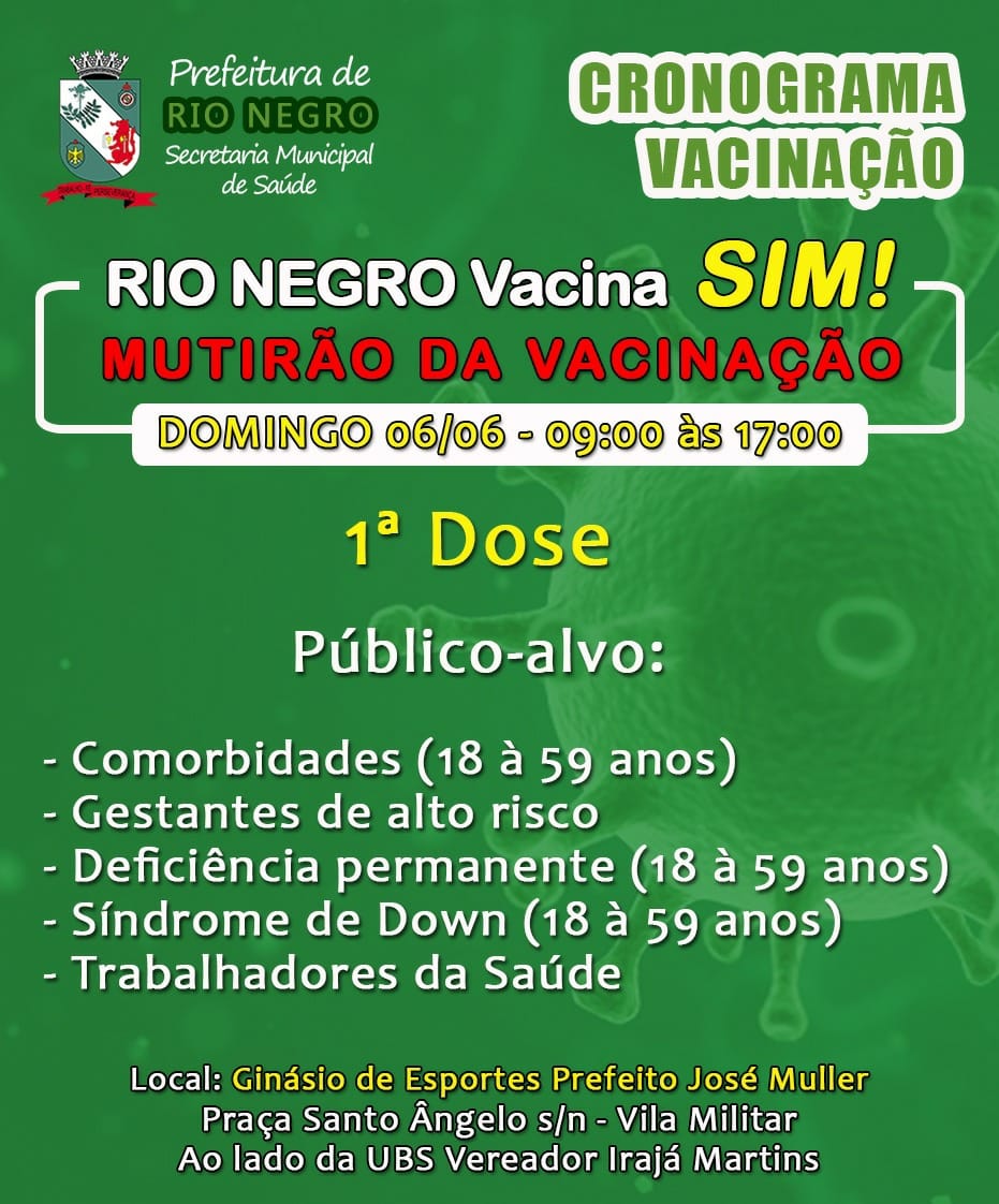 Neste domingo (dia 06), das 9h às 17h, Rio Negro realizará a vacinação contra a Covid-19 na população de 18 a 59 anos de idade que possuem comorbidades.