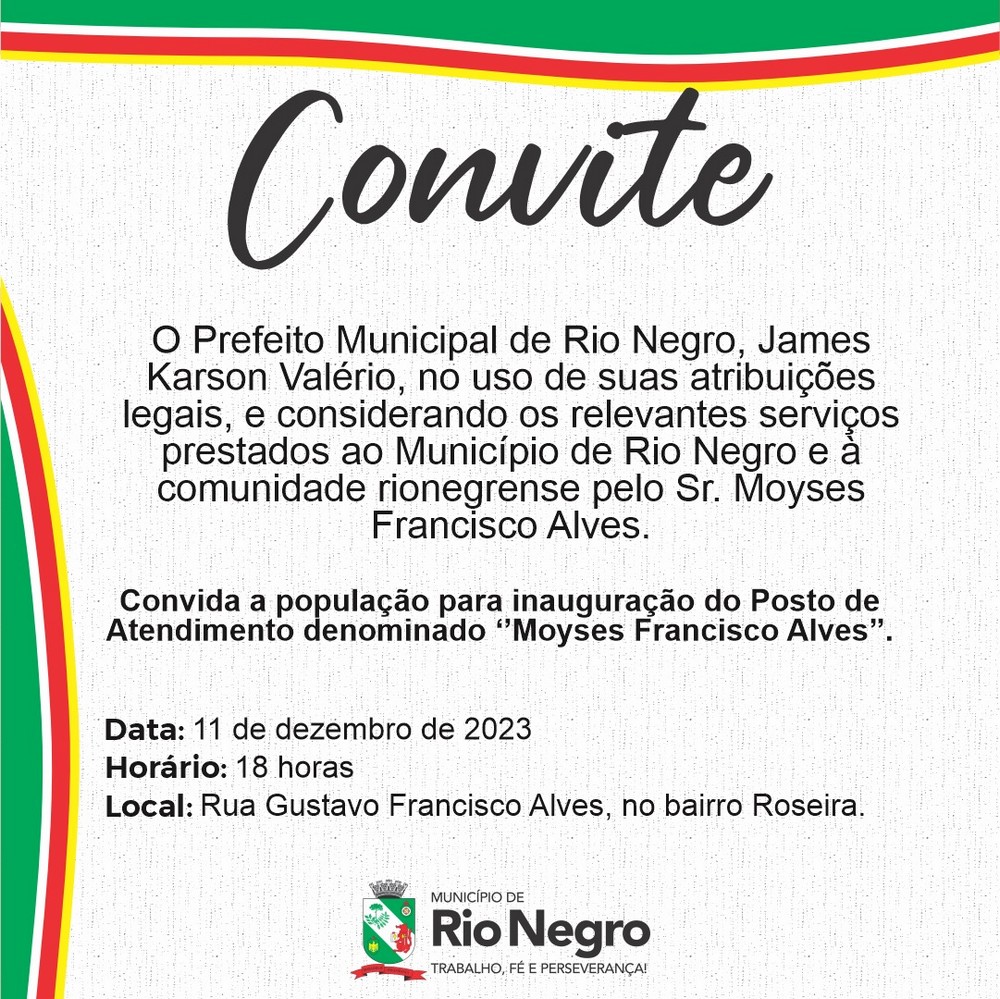 Considerando os relevantes serviços prestados ao Município de Rio Negro e à comunidade rio-negrense, através do Decreto nº 194/2023 assinado pelo prefeito James Karson Valério, o local fica denominado de Posto de Atendimento “Moyses Francisco Alves”. Após a inauguração mais informações sobre o local serão divulgadas.