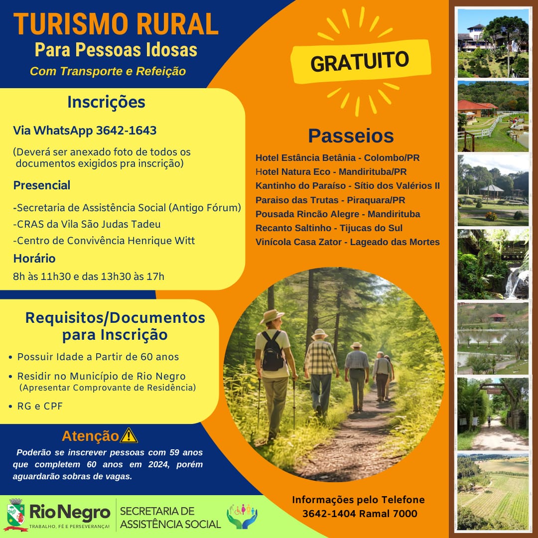 A Prefeitura de Rio Negro, por meio da Secretaria de Assistência Social, anuncia a abertura das inscrições para os idosos interessados em participar das viagens de Turismo Rural. As inscrições começam hoje, dia 27 de maio, e estarão abertas até 21 de junho de 2024. As viagens serão realizadas no mês de junho.