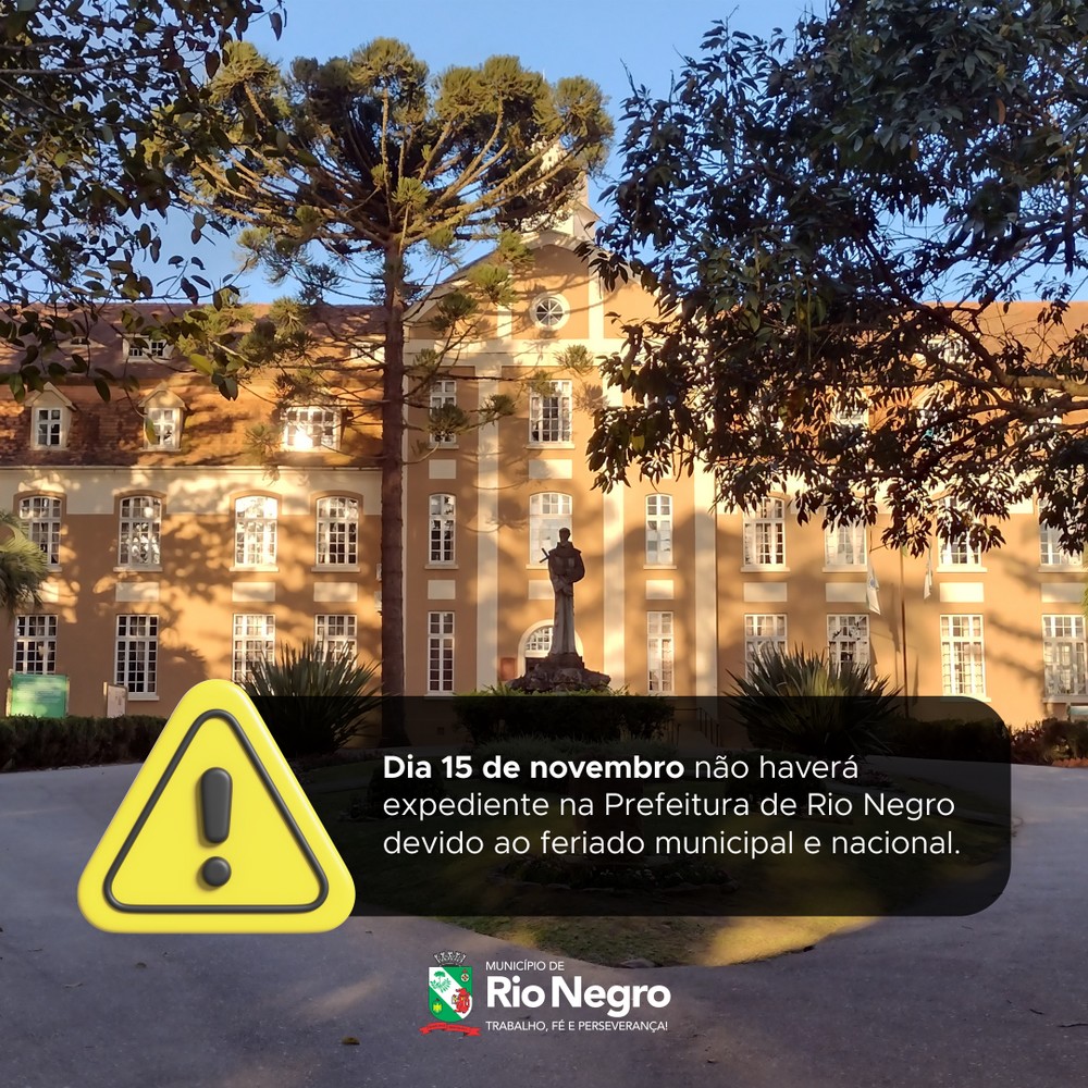 Nesta quarta-feira não haverá expediente na Prefeitura de Rio Negro devido ao dia da Emancipação Política de Rio Negro e dia da Proclamação da República, feriado municipal e nacional, de acordo com o Decreto nº 90/2023.