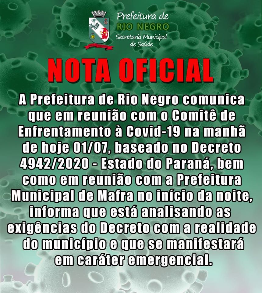 Em nota divulgada nesta quarta-feira, a prefeitura de Rio Negro informou que em face das medidas apontadas pelo Decreto Estadual 4942/2020, está realizando reuniões de discussão e estudos para definir a melhor estratégia no combate ao coronavírus no município.