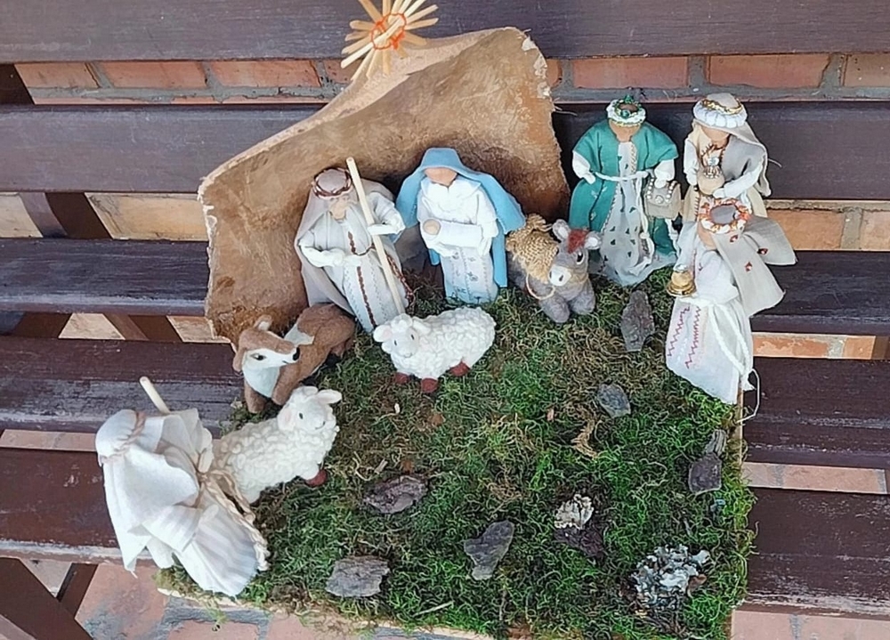 O presépio está confeccionado em base de madeira de reaproveitamento, com uma casca de palmeira Jerivá, madeira de reaproveitamento e de reflorestamento para as personagens, os quais foram vestidos com tecidos de algodão e linho com bordado a mão. Os animais estão confeccionados com técnica de feltragem de lã natural.