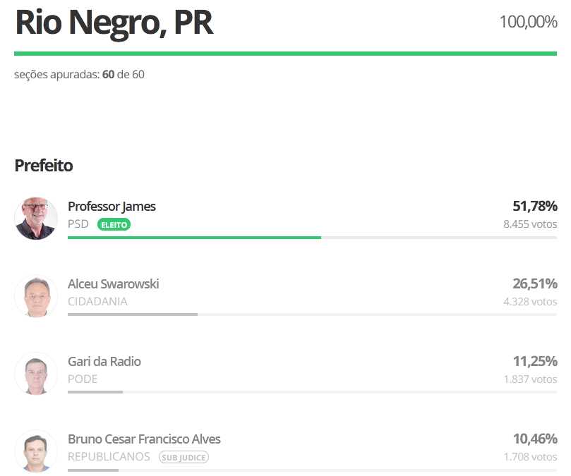 Com 100% das urnas apuradas, Rio Negro possui o nome do prefeito eleito: James Karson Valério, o “Professor James”. O vice eleito é Alessandro Cristian Von Linsingen, também professor.