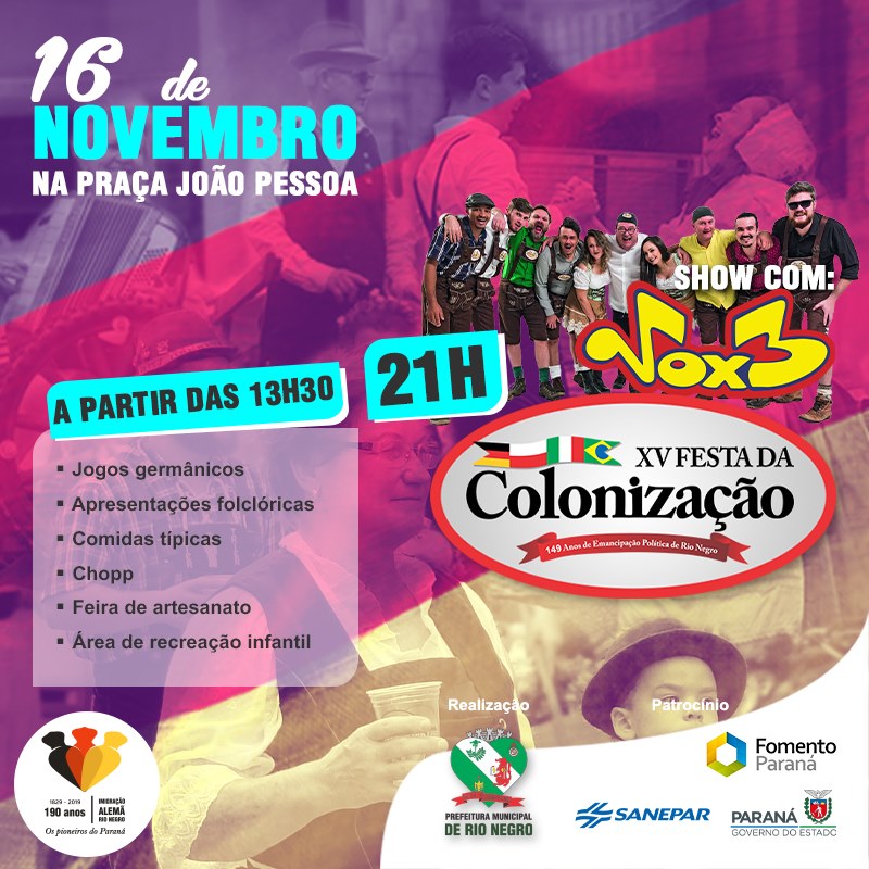 Confira a programação da XV Festa da Colonização em Comemoração aos 149 anos de Emancipação Política de Rio Negro. Entre as atrações estão as feiras de artesanato, praça de alimentação, shows com bandas locais e atividades recreativas.