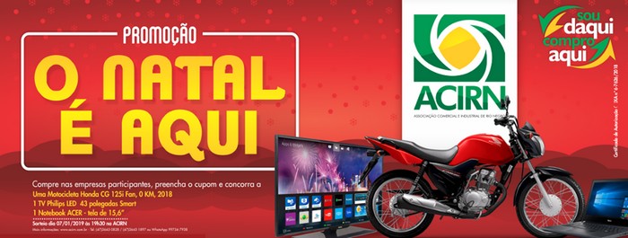 A Associação Comercial e Industrial de Rio Negro (ACIRN) está divulgando as empresas que estão participando da promoção “O Natal é aqui”, que vai sortear no dia 7 de janeiro uma moto CG 0 km, uma televisão de LED de 43” e um notebook.