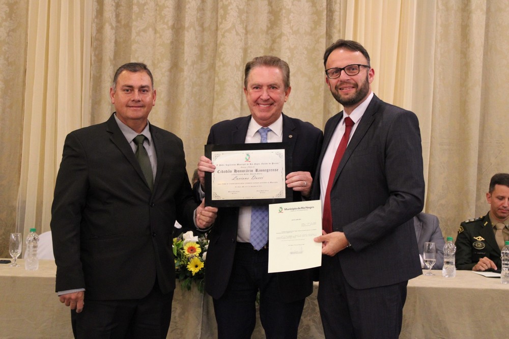 O Deputado Federal Luciano Ducci também recebeu o tÃtulo de “Cidadão Honorário”. No seu terceiro mandato, Ducci destinou R$15 milhões em emendas para obras, educação, saúde, agricultura e fazenda em Rio Negro. Por auxiliar o desenvolvimento do municÃpio, foi reconhecido pelos vereadores.