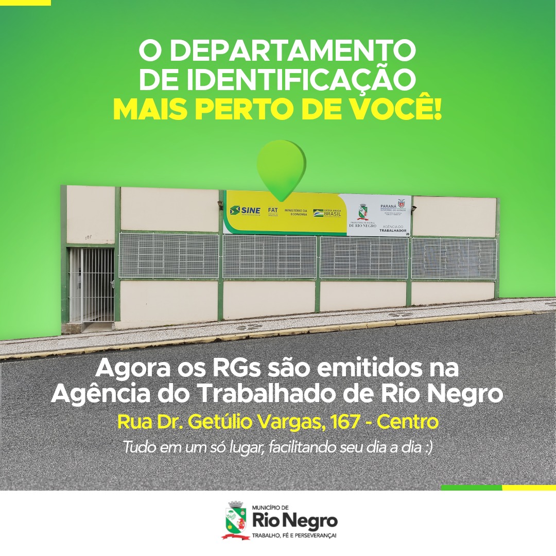 A partir desta quarta-feira (09), o departamento de identificação de Rio Negro está atendendo na Agência do Trabalhador (SINE), no Centro do municÃpio.