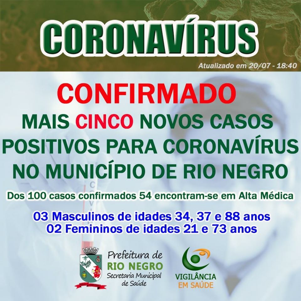 Cinco novos casos de Covid-19 foram confirmados em Rio Negro nesta segunda-feira, chegando ao 100º caso positivo. Dos 100 casos confirmados, 54 pessoas já estão recuperadas.