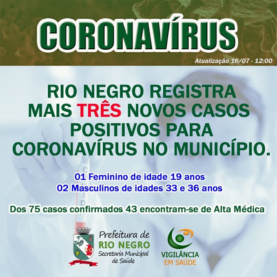 Rio Negro confirmou mais três casos de Covid-19 (coronavírus) nesta quinta-feira (16). Atualmente, dos 75 casos positivos confirmados, 43 pessoas já estão recuperadas.