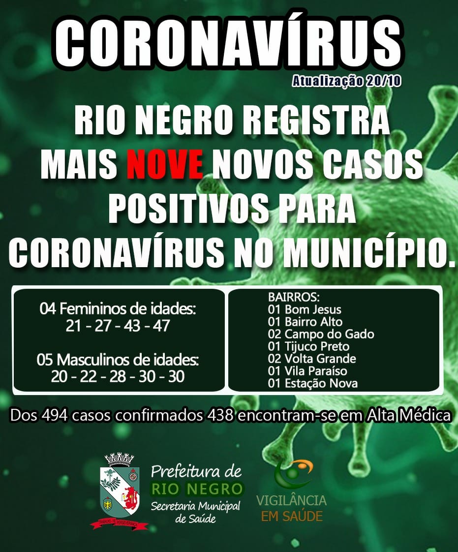 Rio Negro confirmou nesta terça-feira (20) nove novos casos positivos de Covid-19. No total, dos 494 casos já confirmados, 438 pessoas estão recuperadas.