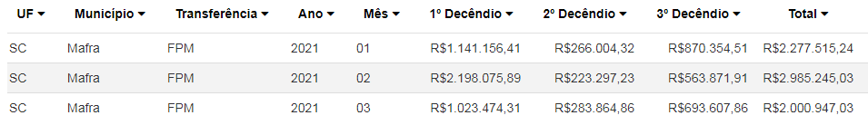Mafra recebeu o valor consolidado de R$ 7.263.707,30 referente aos meses da janeiro, fevereiro e março. No mês de janeiro o municÃpio mafrense recebeu R$ 2.277.515,24; em fevereiro R$ 2.985.245,03; e em março R$ 2.000.947,03.