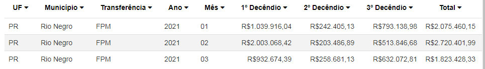 Já Rio Negro recebeu R$ 2.075.460,15 em janeiro, R$ 2.720.401,99 em fevereiro e R$ 1.823.428,33 em março, chegando ao total de R$ 6.619.2090,47 nos três primeiros meses do ano.