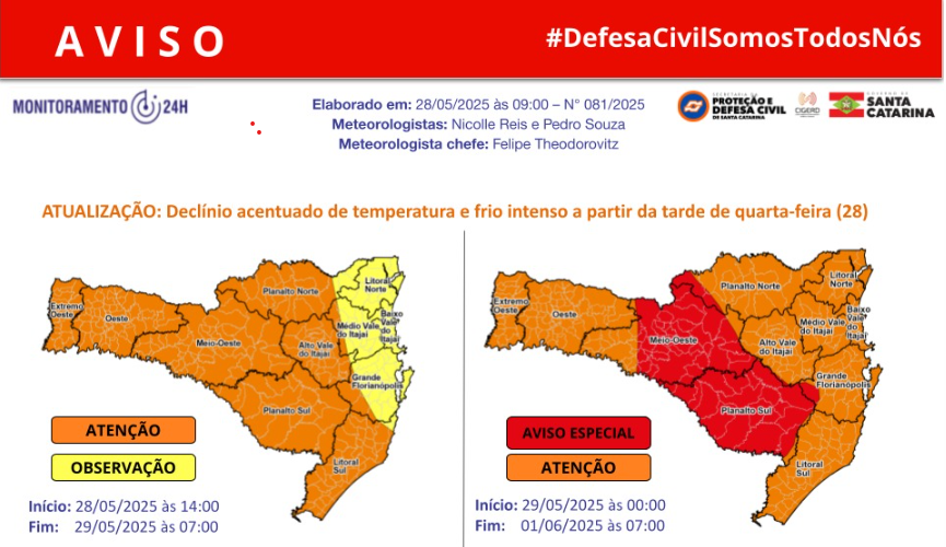A Defesa Civil de Mafra alerta para o declínio acentuado da temperatura a partir da tarde desta terça-feira, dia 28. “Mafra está na área de “Estado de Atenção”, conforme alerta da Defesa Civil de Santa Catarina, que indicam que, após a passagem da frente fria, nesta quarta-feira, uma massa de ar seco e frio avança pelo Sul do Brasil, proporcionando uma queda acentuada nas temperaturas em todas as regiões de Santa Catarina”.