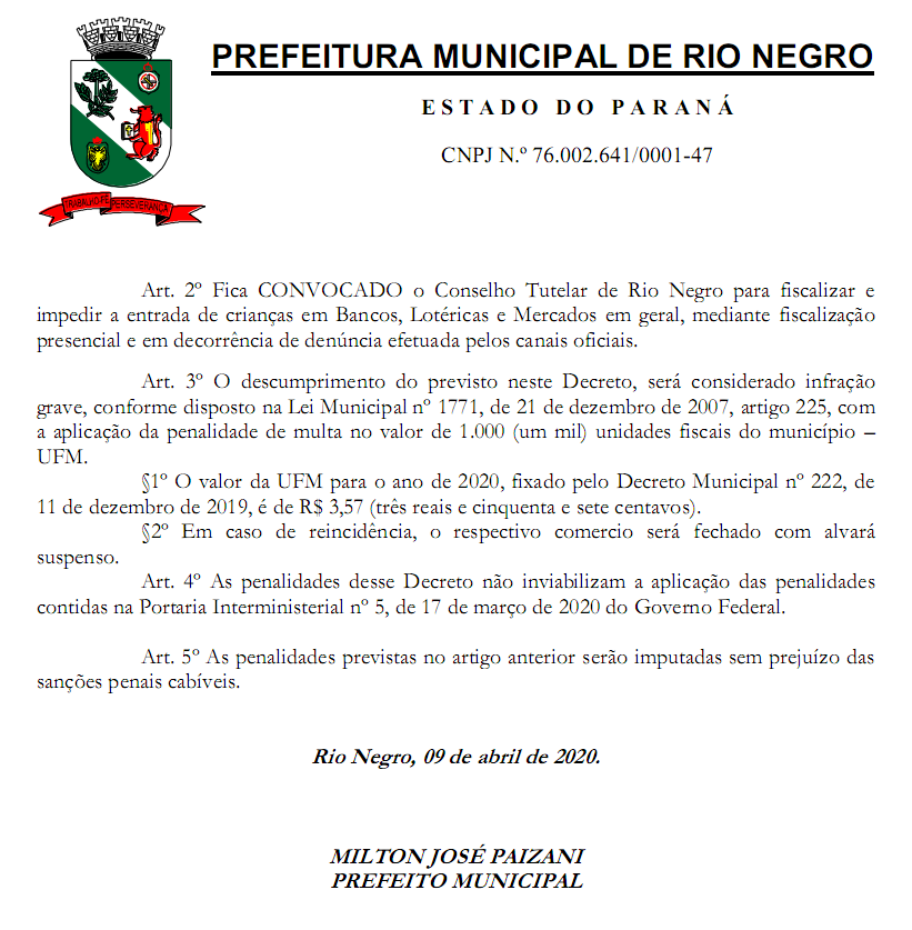 A cidade de Rio Negro-PR publicou nesta quinta-feira (09) um Decreto que limita o número de pessoas em estabelecimentos da cidade. Cabe aos estabelecimentos seguir a recomendação como medida de prevenção ao COVID-19 (coronavÃrus).
