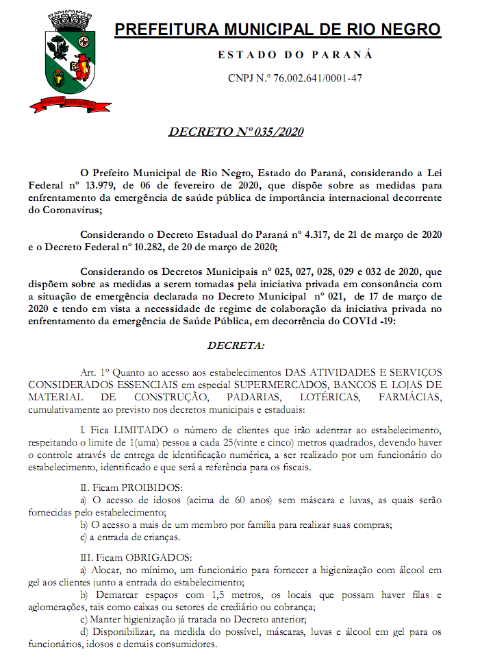 A cidade de Rio Negro-PR publicou nesta quinta-feira (09) um Decreto que limita o número de pessoas em estabelecimentos da cidade. Cabe aos estabelecimentos seguir a recomendação como medida de prevenção ao COVID-19 (coronavÃrus).