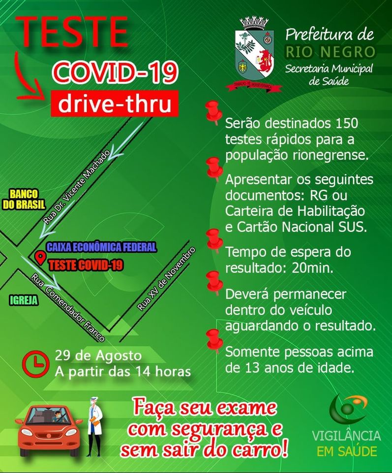 Neste sábado (29) a cidade de Rio Negro realizará testes rápidos em drive-thru para a Covid-19. Será a partir das 14h no Centro da cidade, em frente ao banco Caixa.