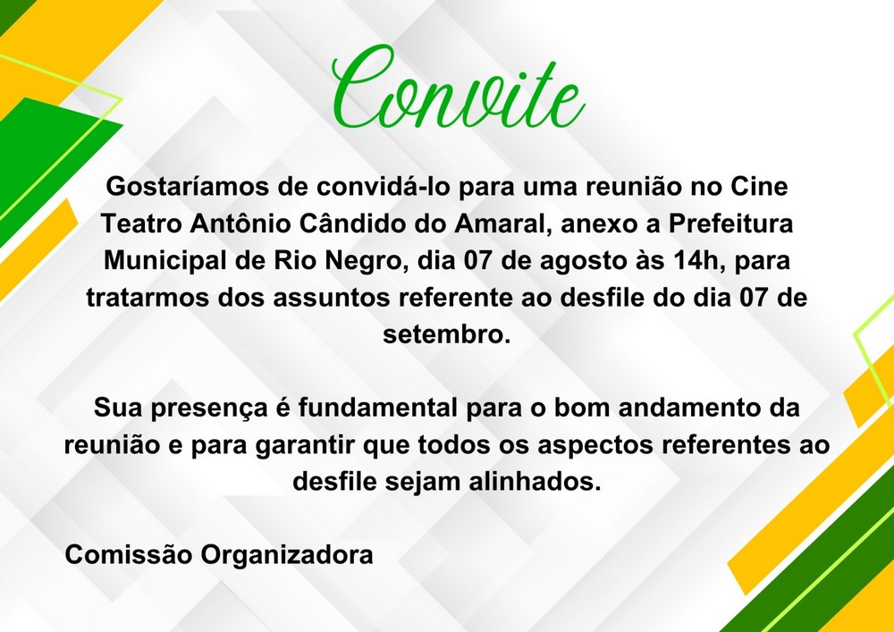 Neste ano o Desfile CÃvico de 7 de Setembro será realizado em Rio Negro. A organização será de responsabilidade da Secretaria Municipal de Cultura e Turismo.