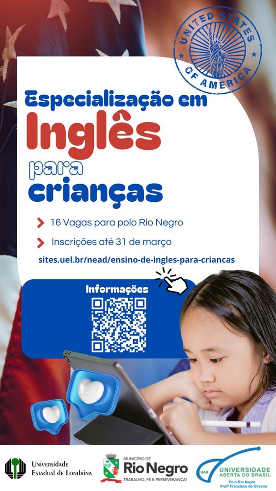Estão abertas em Rio Negro as inscrições para o curso gratuito de especialização em Ensino de Inglês para Crianças, que será realizado pela Universidade Estadual de Londrina (UEL) através da parceria com o Polo de Apoio Presencial Professor Francisco de Oliveira, que é mantido pela Secretaria Municipal de Educação.