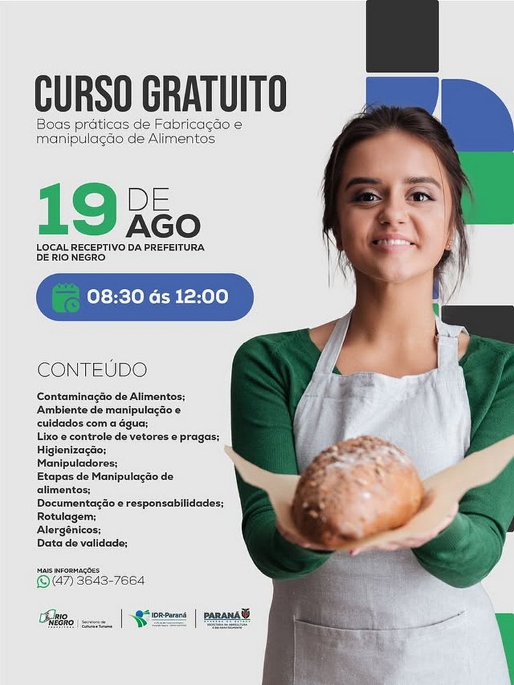 Através de uma parceria com o Instituto de Desenvolvimento Rural do Paraná (IDR-Paraná) e Governo do Estado, a Prefeitura de Rio Negro realizará o curso gratuito de Boas Práticas na Fabricação e Manipulação de Alimentos.