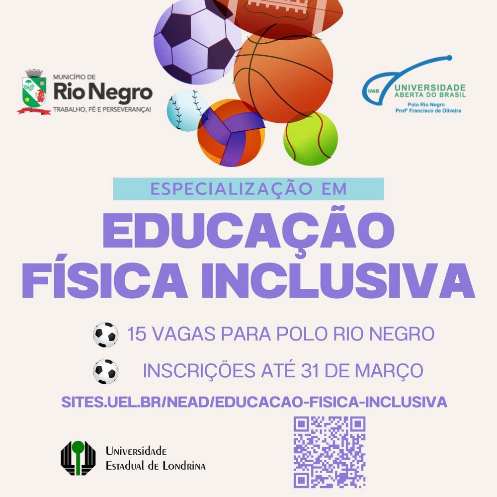 Até o dia 31 de março é possível se inscrever para o curso gratuito de especialização em Educação Física Inclusiva. Estão sendo disponibilizadas 15 vagas para o município de Rio Negro.