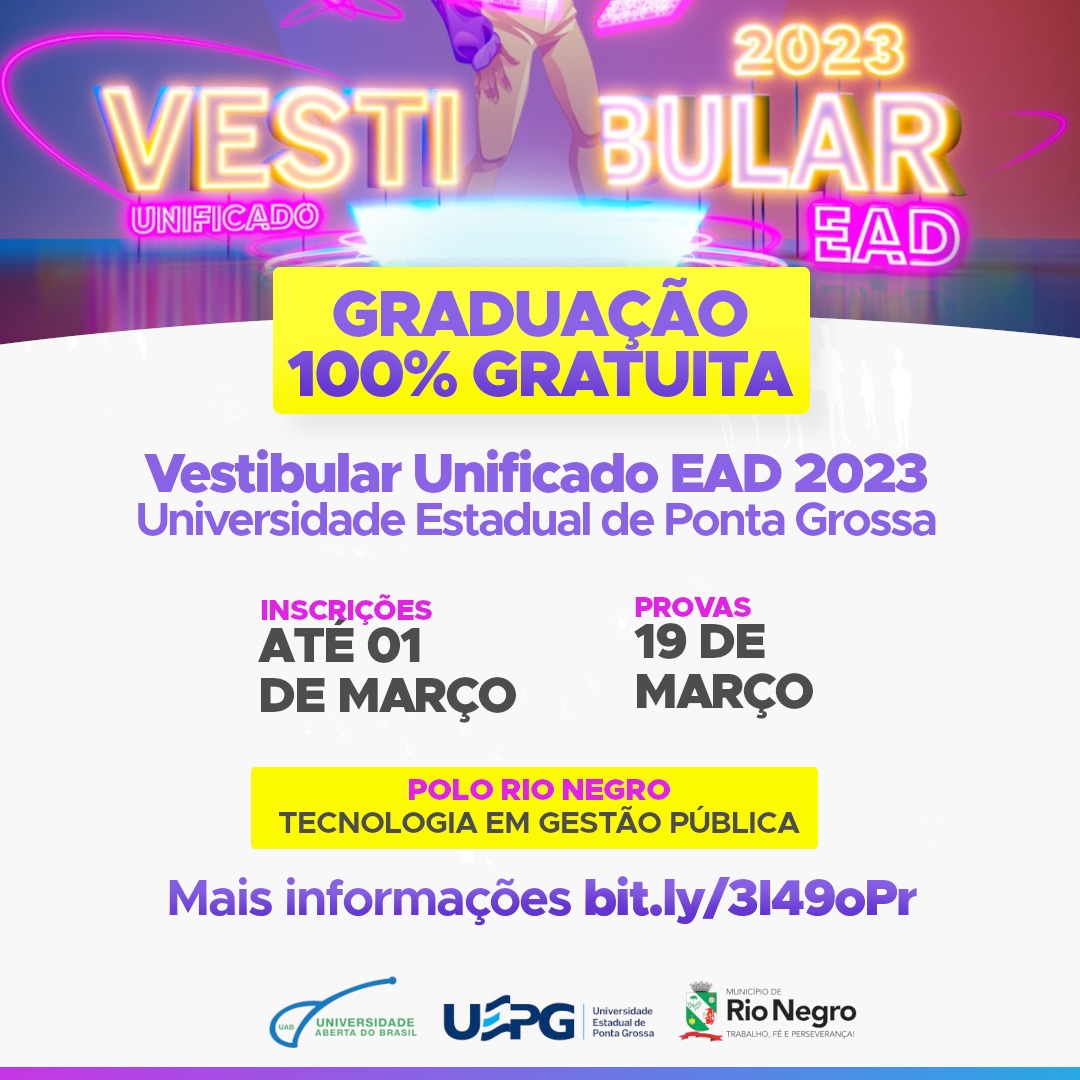 Estão abertas as inscrições para o curso de Tecnologia em Gestão Pública pela Universidade Estadual de Ponta Grossa (UEPG). Para Rio Negro são 20 vagas disponíveis para o curso que será realizado na modalidade à distância, com aulas no Polo de Apoio Presencial Professor Francisco de Oliveira, que fica localizado junto ao Parque Ecoturístico Municipal São Luís de Tolosa e Prefeitura, na Rua Juvenal Ferreira Pinto, nº 2070.