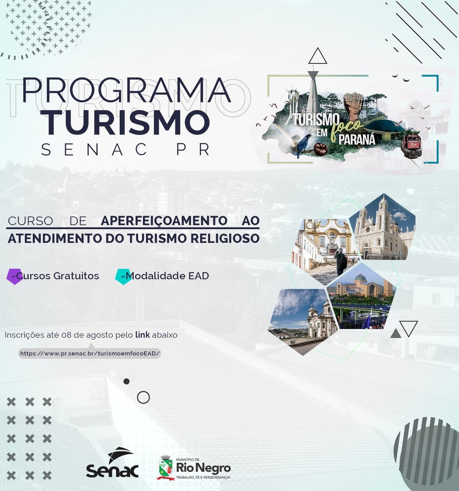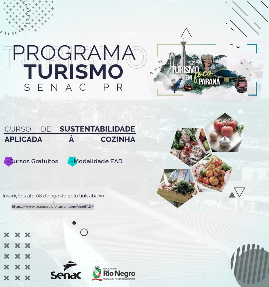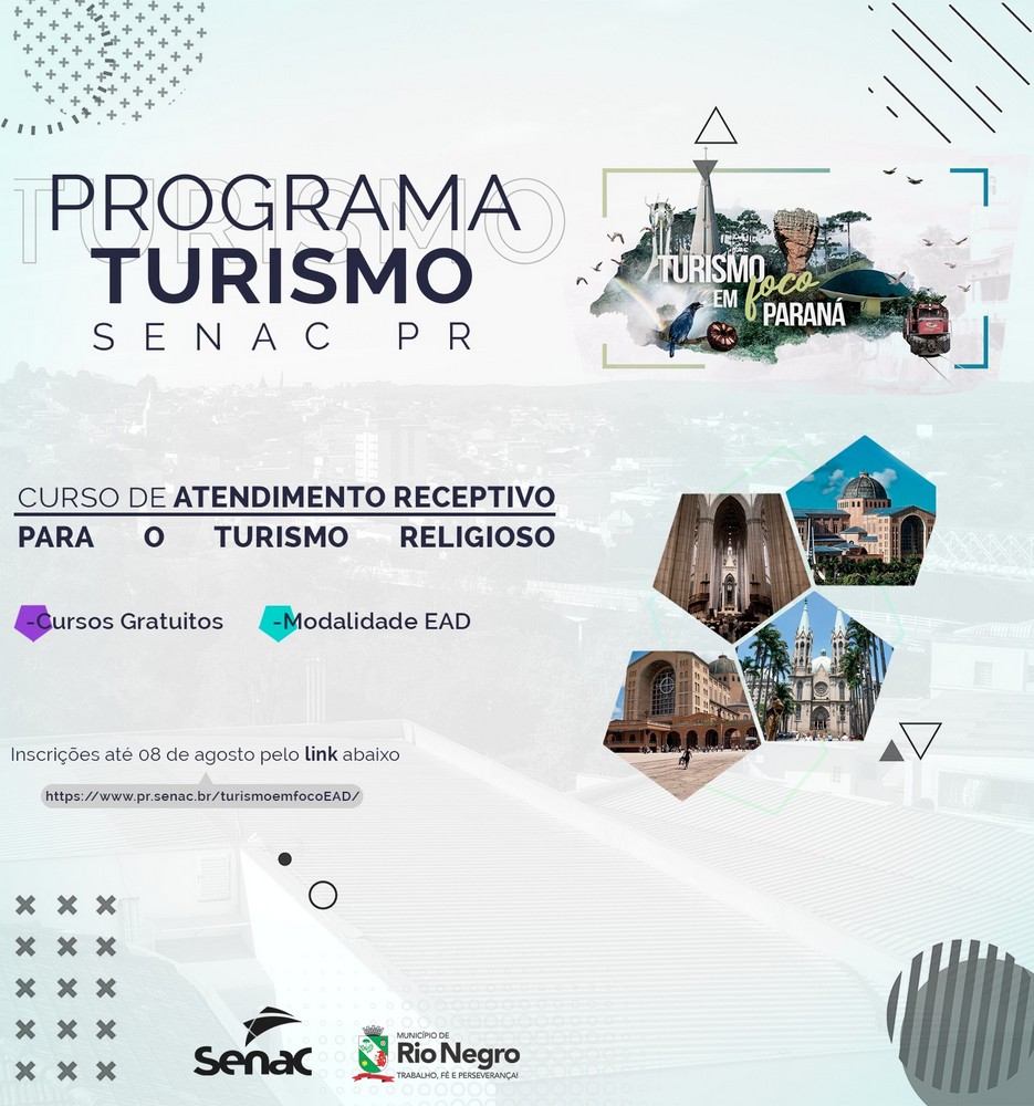As inscrições são gratuitas e podem ser feitas até o dia 08 de agosto, pelo link https://www.pr.senac.br/turismoemfocoEAD/
