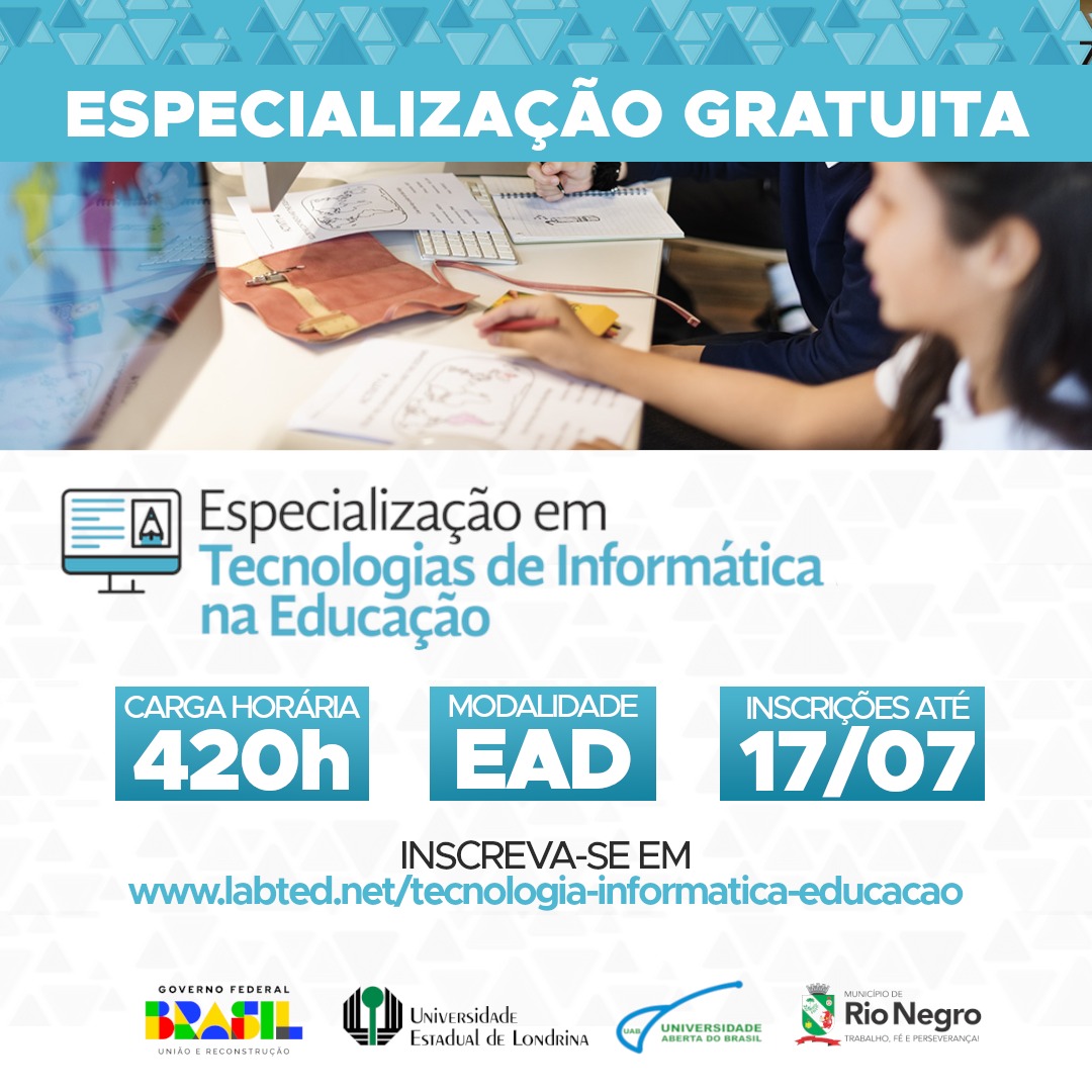 Estão abertas as inscrições para especialização gratuita em Tecnologias de Informática na Educação oferecida pela Universidade Estadual de Londrina no Polo UAB de Rio Negro.