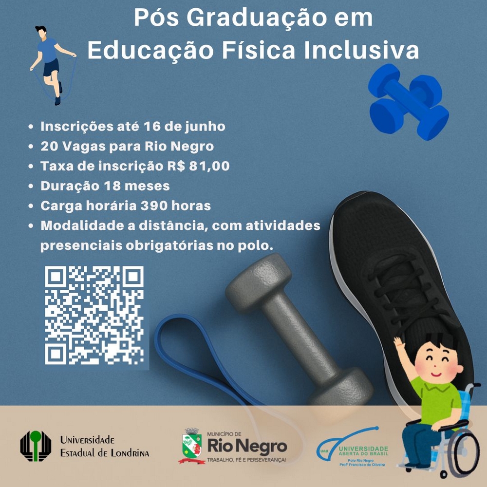 Voltado à formação de profissionais para atuação inclusiva na área de Educação FÃsica. São 15 vagas disponÃveis para o polo de Rio Negro.