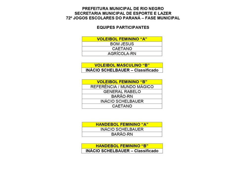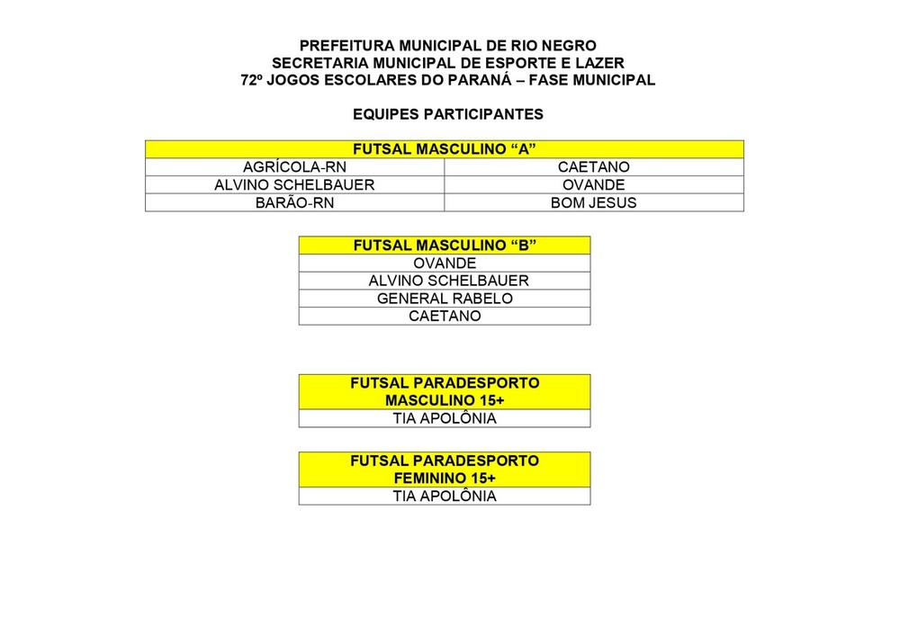 No encontro foram confirmadas as equipes participantes e definida a forma de disputa de cada categoria. Neste ano a fase municipal terá os seguintes números:
