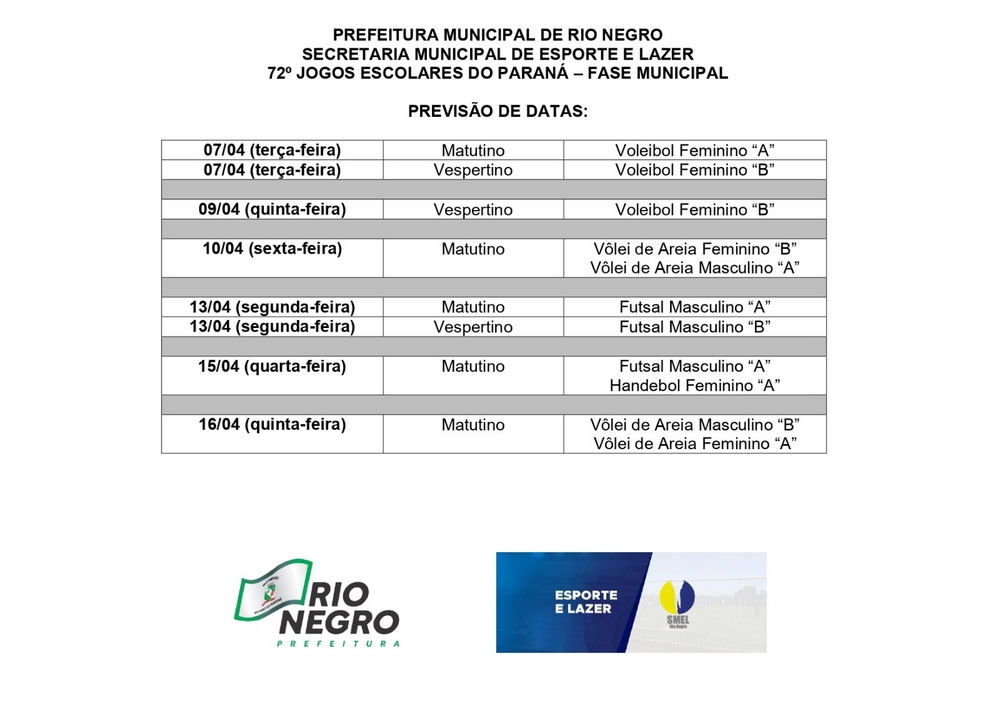 A Secretaria Municipal de Esportes e Lazer (SMEL) de Rio Negro já está preparando a fase municipal dos 72º Jogos Escolares do Paraná.