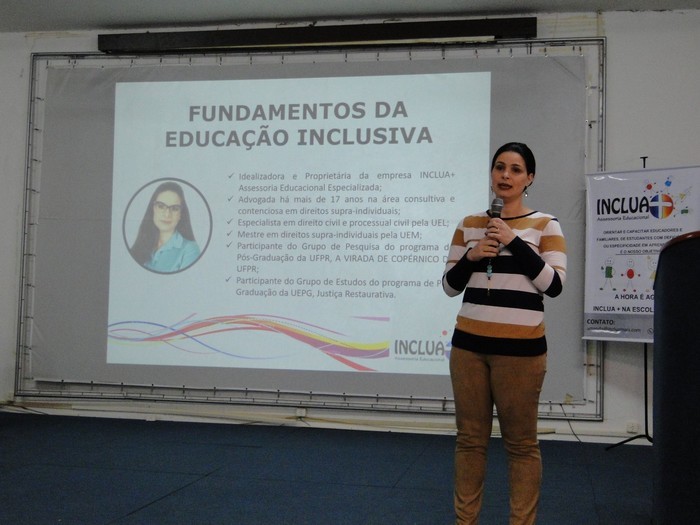 Durante todo o dia os professores da Rede Municipal de Educação tiveram a oportunidade de apreciar palestras com profissionais do “Projeto Inclua – Assessoria Educacional”, como a da mestre Amanda Gimenes Coutinho, que falou sobre os ‘fundamentos jurídicos da educação inclusiva’; também a psicóloga Sibele Camargo Schuch, que explanou sobre ‘psicologia organizacional: resgatando a comunicação, habilidades e competência para inclusão’; e a psicóloga Caroline Domanski, que abordou a palestra de ‘psicologia clínica: transtorno do espectro autista como demanda de inclusão no ensino regular’.