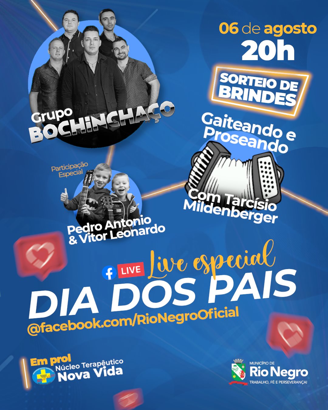A live será realizada na página oficial da Secretaria de Cultura e Turismo de Rio Negro no Facebbok. Além da animação das apresentações para seu paizão, a live contará com sorteio de brindes aos espectadores.