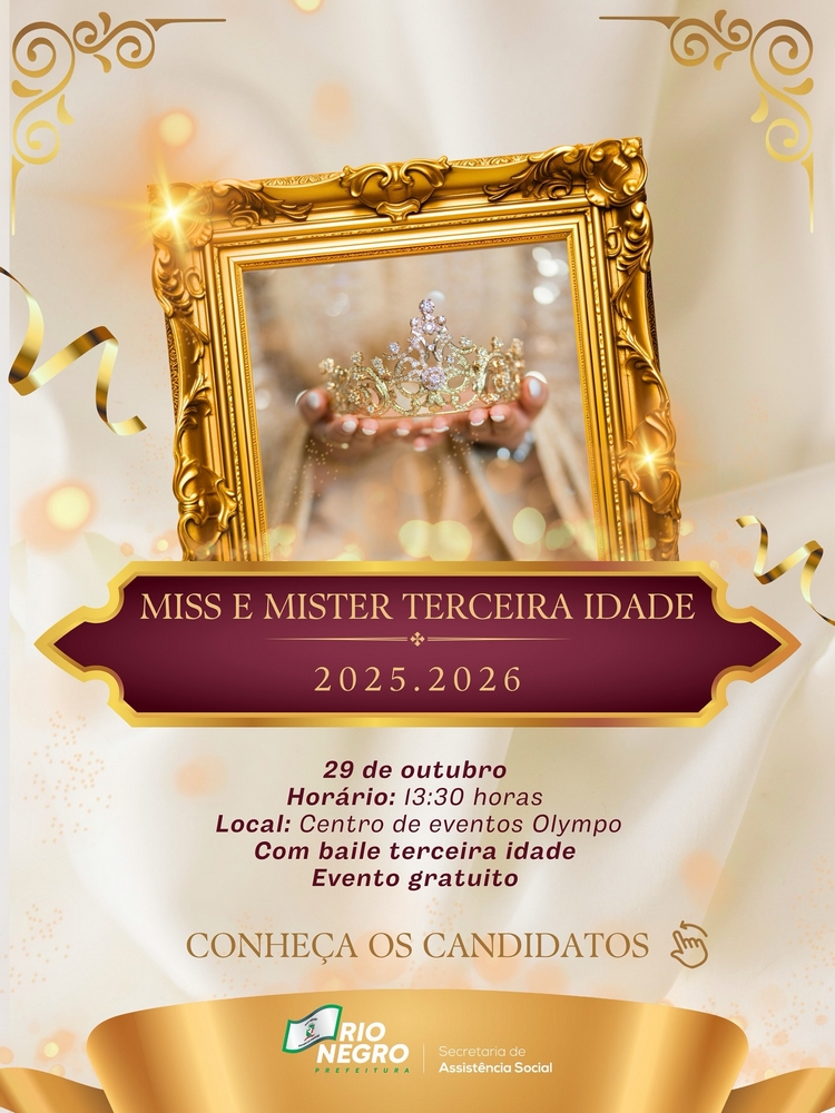 Rio Negro realizará nesta quarta-feira o Concurso de Beleza “Miss e Mister Terceira Idade 2025/2026”. A ação é promovida pela Secretaria de Assistência Social como parte da programação do mês de valorização ao idoso.